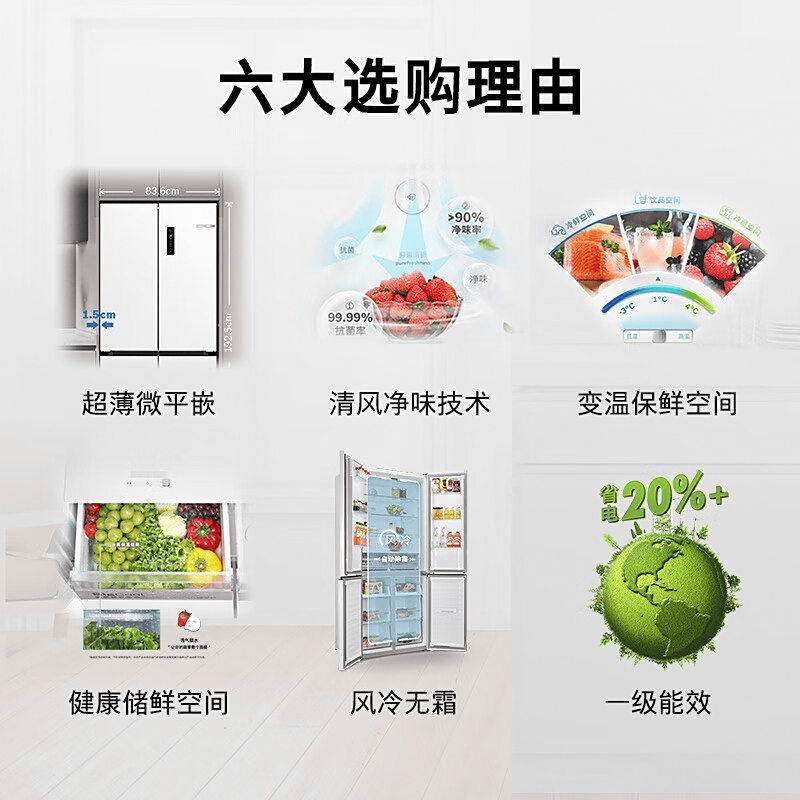 风冷设计无霜:先进的循环立体送风技术在提升储鲜效果的同时,有效避免了结霜问题。无需手动除霜,省时省力,让厨房更整洁。此设计让食材保持最佳新鲜状态,同时延长了保鲜周期,使得家中的美味尽情享受,无需担忧冰箱清理的麻烦。