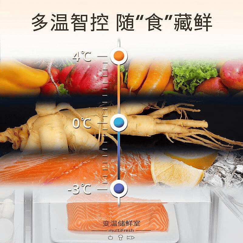 三门三温区设计:满足不同食材保存需求,为您的厨房增添了更多灵活性与便利。优秀的分区调温功能,让冰箱能够根据不同食物的特性进行个性化管理。这种针对性的储存方式,大大提升了食材的新鲜度,同时避免了交叉污染的问题。冷藏、冷冻、变温三区域的对应使用,让每一餐都能充满期待,食材随时待用,新鲜与健康触手可及。