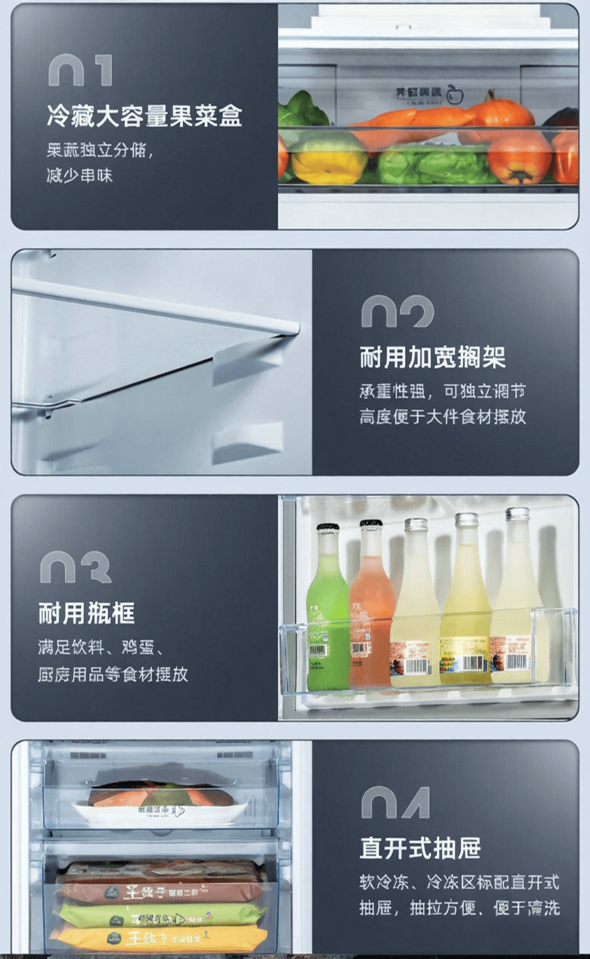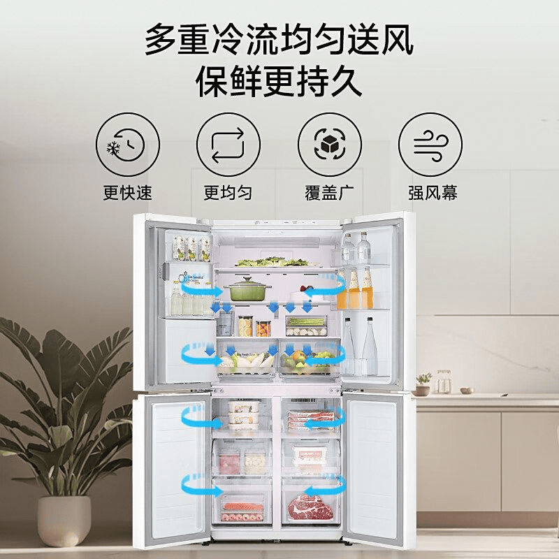 独特四开门布局:四开门设计让食材存取变得更加灵活,能够根据不同食材进行分类存放,既便于寻找,也有效利用了内部空间。这种智能布局使用户在使用时无需频繁开关门,从而提高能效与便利性,非常适合忙碌的生活节奏,节省更多宝贵时间。
